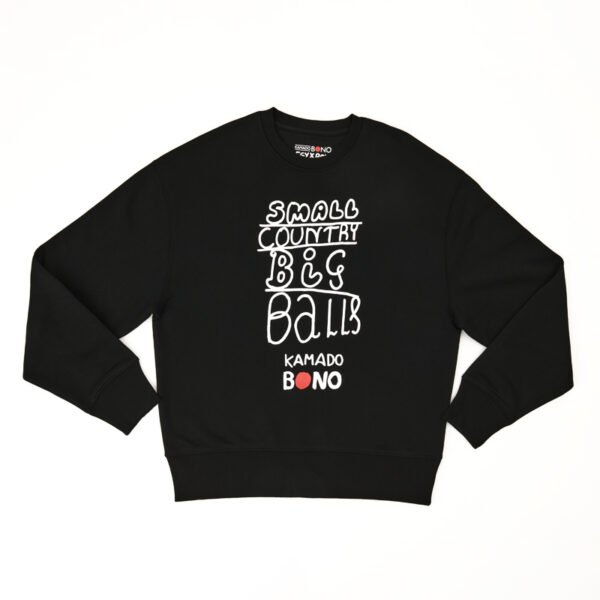 Laadukas ja mukava musta collegepaita, jossa painettu teksti ’Small country big balls’ – sopii sekä miehille että naisille.