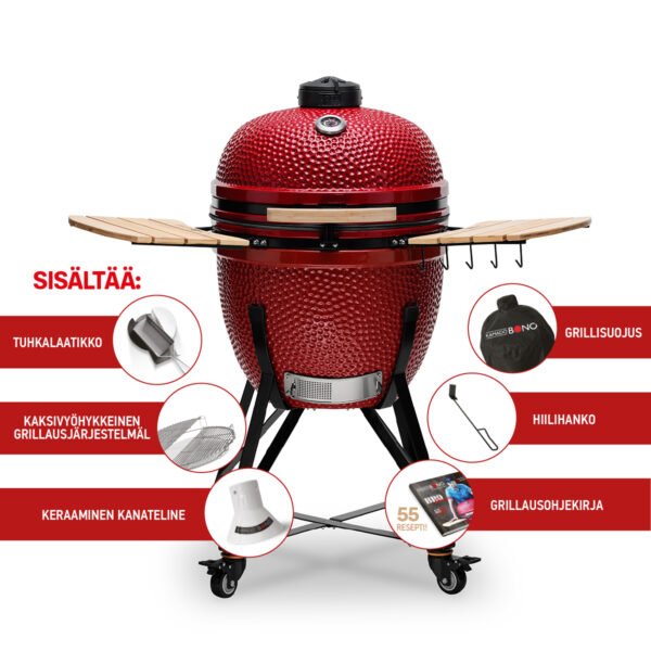 Suuri grilli tilavalla grillausalalla, täydellinen valinta takapihalle, terassille, mökille tai ammattikäyttöön, kuten catering-toimintaan. Kaikilla keraamisilla osilla on rajoittamaton takuu ja Bono Care -suoja luonnollisille henkilöasiakkaille.