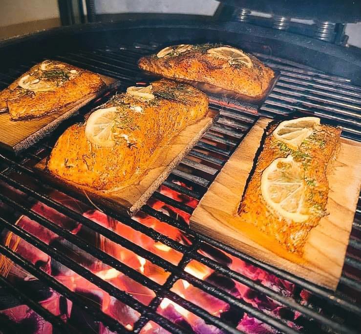 - Aseta lohi liotetun setrilankun päälle ja grillaa noin 20 minuuttia tai kunnes kalan sisälämpötila on 50 °C.