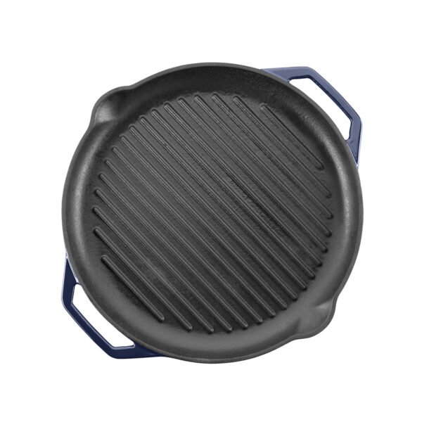 Tämä klassinen, pyöreä valurautapannu, jossa on ulkopuolella värillinen emalipinnoite ja grillikuvio, tekee suosikkigrilliruokiesi valmistuksesta helppoa.